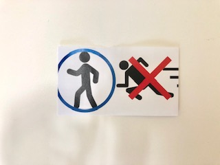 壁との間は通らないで、白線の上を歩きましょう。