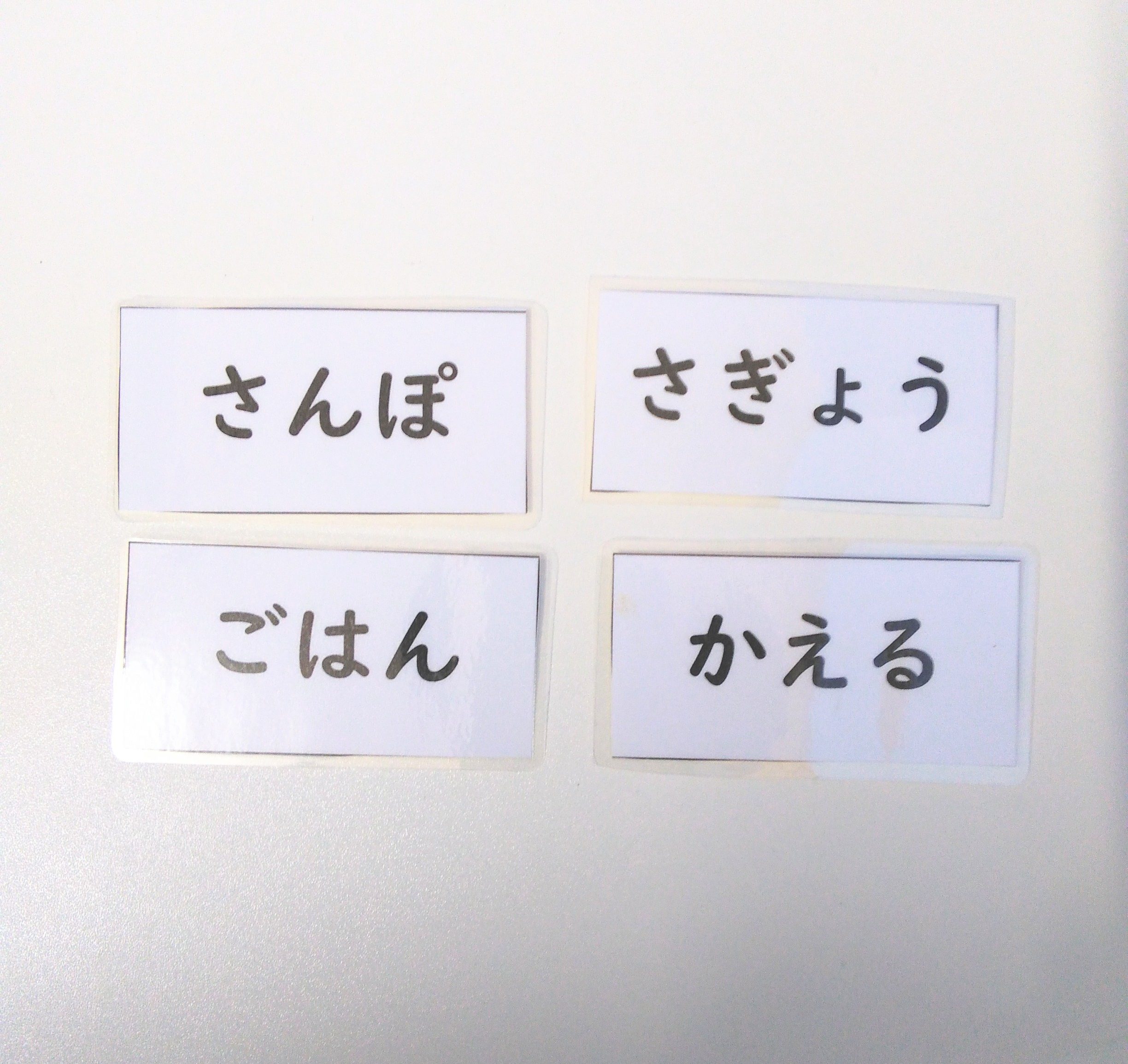 そこで、1日の予定を示すスケジュールは次のような文字カードを使ってみました。